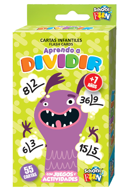 Este juego de cartas está diseñado para desarrollar y ejercitar la habilidad de dividir. Incluye juegos y actividades para hacer más divertida la enseñanza. Puede combinarse con los títulos SCHOOL FUN de SUMAS, RESTAS Y MULTIPLICACIÓN.