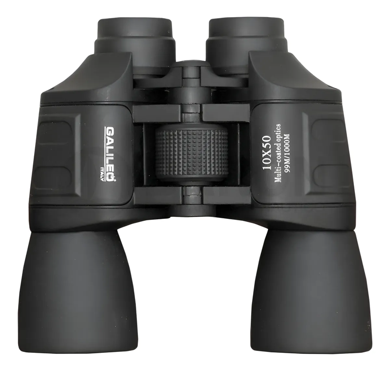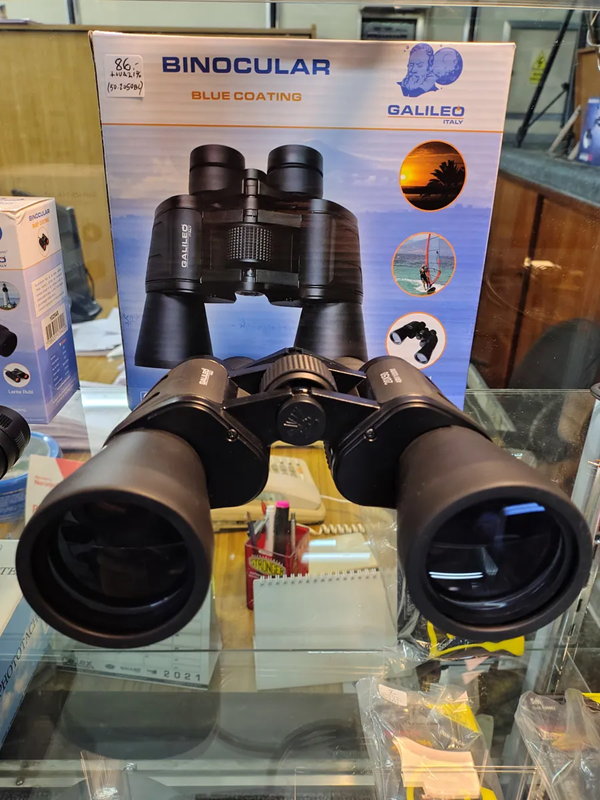 BINOCULAR / PRISMATICO / LARGAVISTAS Recubierto en goma. Lentes Blue. Aumento: 20x Ø del objetivo: 50 mm. Ángulo de visión: 5º Campo visual: 58 m / 1000 m Ø pupilar: 4. 2 mm. Peso: 780 gr. Con estuche flexible, correa, protectores de goma para los lentes, franela y presentado en caja de cartón. Marca GALILEO. Modelo: 50-2050BL