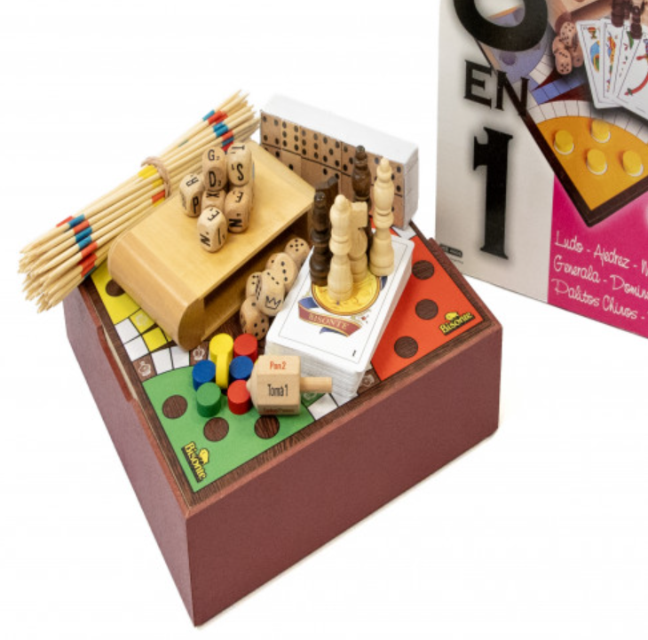 Incluye: - Ludo - Ajedrez - Naipes españoles - Generala - Dominó - Generaletra - Palitos chinos - Perinola.