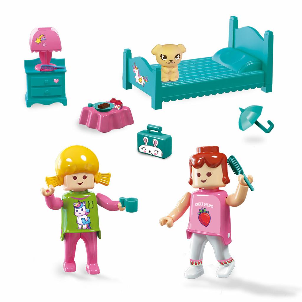 Incluye 2 personajes articulados de 7,5 cm, muebles, 14 accesorios y stickers para decorar!