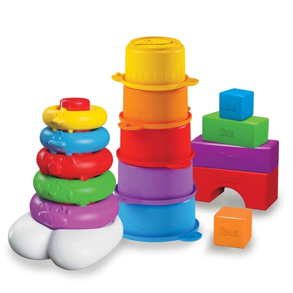 El apilable Bimbi le plantea al niño desafíos de estabilidad promoviendo el ensayo-error y la tolerancia durante la actividad. Despierta el interés por descubrir colores y números, motiva al armado de estructuras más grandes a partir de la combinación de los tres productos que contiene el kit.