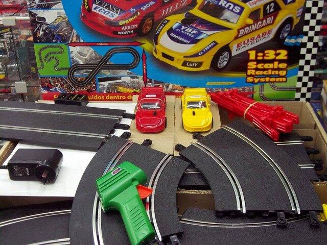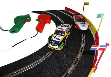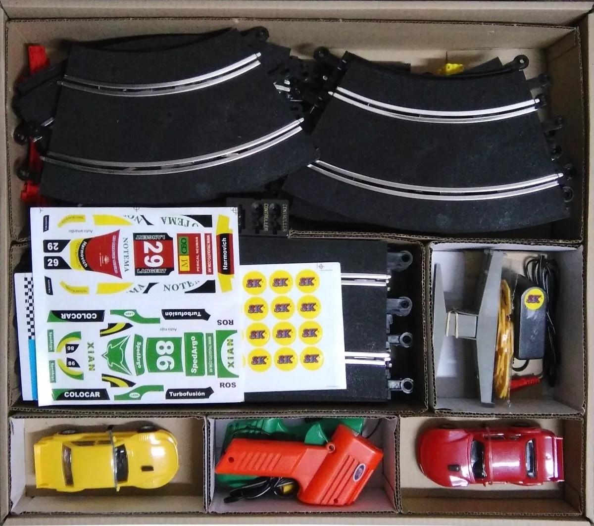 Incluye: 2 autos, 2 pulsadores, vallas de contención, fuente de alimentación, 1 par de bases para puente, set debarandas o guardarails con mástiles y banderas, set de peraltes y transformador de 12 voltios.