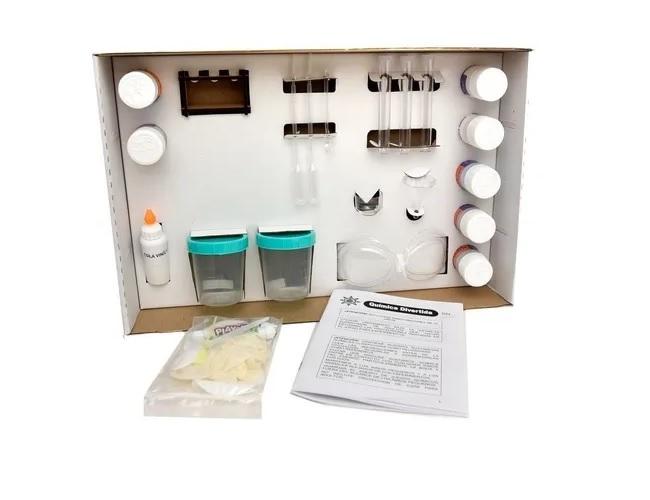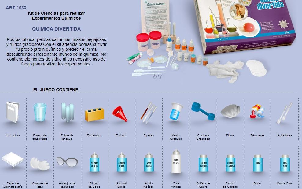 Podrás fabricar pelotas saltarinas, masas pegajosas y ruidos graciosos! Con el kit además podrás cultivar tu propio jardín químico y predecir el clima descubriendo el fascinante mundo de la química. No contiene elementos de vidrio ni es necesario uso de fuego para realizar los experimentos.