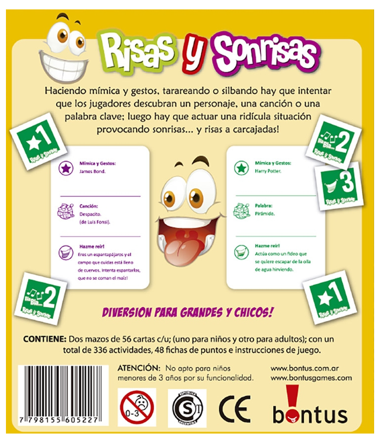 Dos mazos de 56 cartas c/u (uno para niños y otro para adultos); con un total de 336 actividades, 48 fichas de puntos e instrucciones de juego.