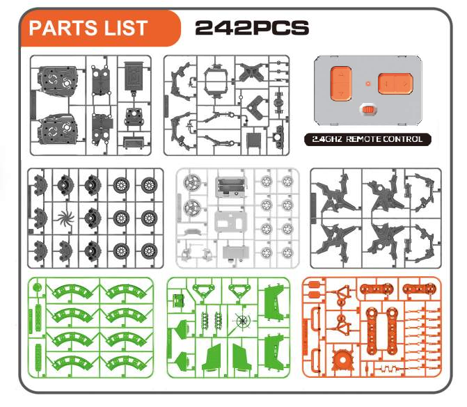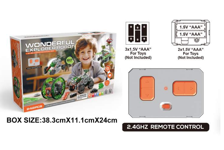 Este kit versátil permite a los niños construir y personalizar su propio robot capaz de realizar 4 funciones, las cuales pueden ser programadas a radio control.