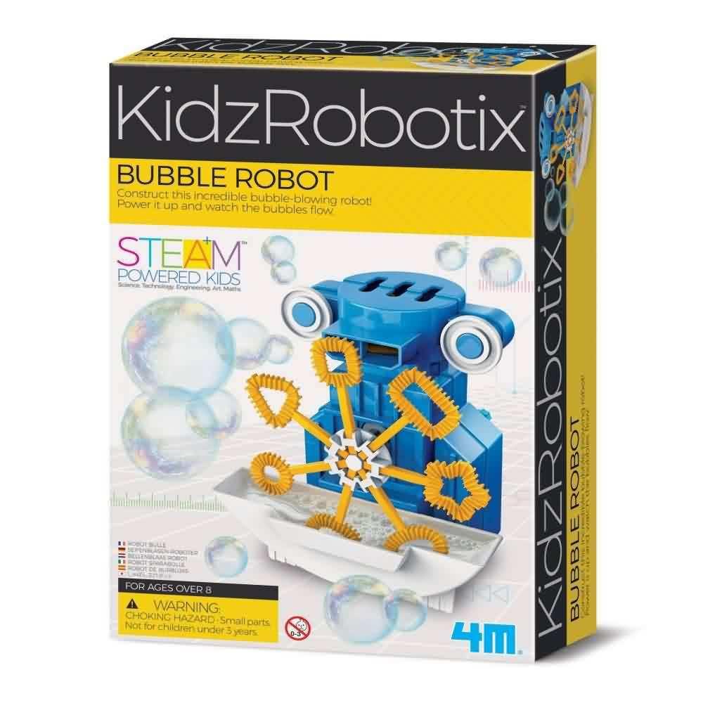 Construye tu simpático robot azul, llena la bandeja con solución para hacer burbujas y observa cómo sopla un torrente de hermosas burbujas.
