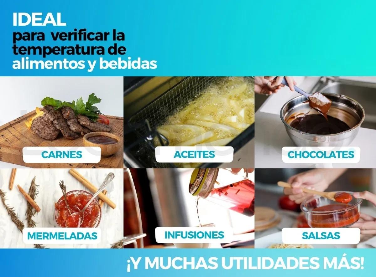 Ideal para verificar la temperatura de alimentos y bebidas (carnes, aceite de fritura, infusiones, chocolates, mermeladas, etc).
