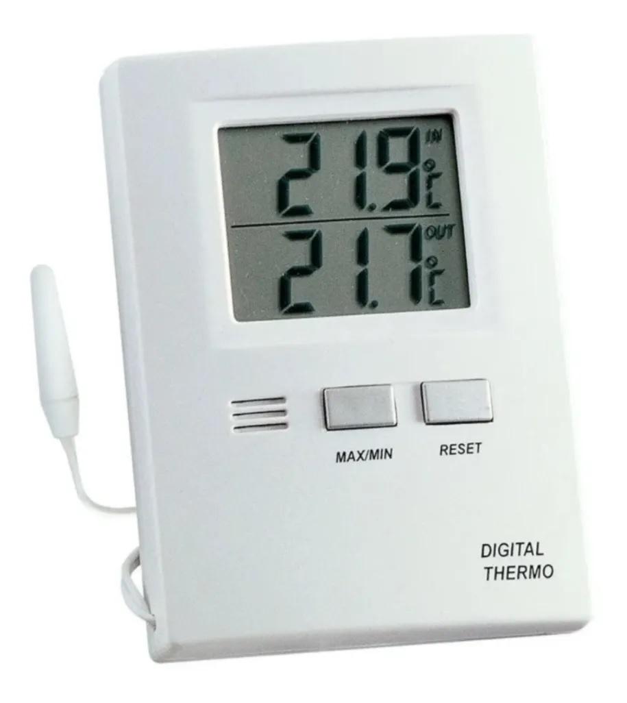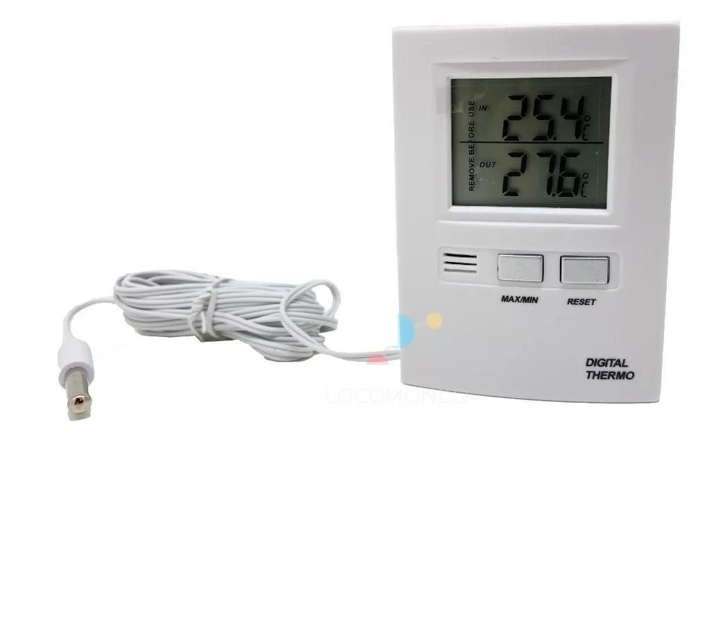 - Doble display de temperatura interior y exterior mediante capilar de 3 m de cable fino para pasar a través del marco de la ventana, con sensor
