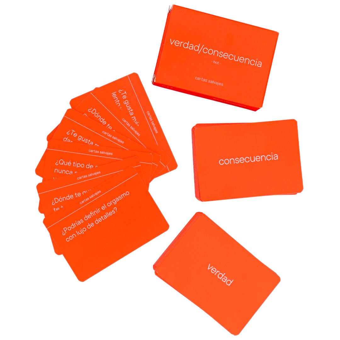 VERDAD o CONSECUENCIA HOT PACK es un complemento de Cartas Salvajes, incluye 50 cartas con 25 preguntas y 25 retos sobre sexo.